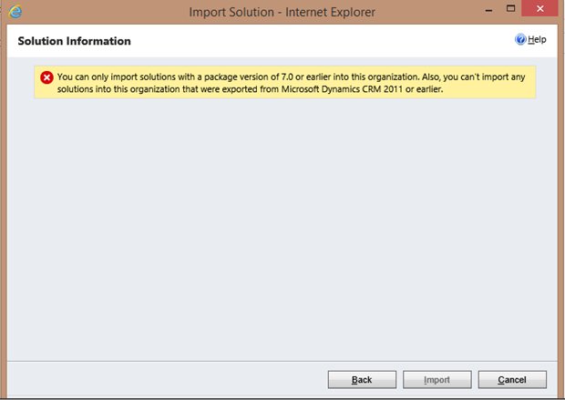 Recently I worked on a piece of demo that requires a solution from codeplex with a solution file that have not been updated for CRM 2015. What I have left is the CRM solution that the author exported from CRM 2011 and what I have for the demo environment is a new CRM Online tenant that based on CRM 2015. While I could reverse engineer of the author’s works to fit into CRM 2015 solution (thanks to the author that providing the source code in Codeplex), but what I would like to know is whether the customization will works fine in CRM 2015 or not. So for testing I would like to import it into my demo org. As I posted before on the CRM solution compatibility matrix, CRM solution that exported from CRM 2011 definitely could not be imported to CRM 2015. This will throw an error as “You can only import solutions with a package version of 7.0 or earlier into this organization. Also, you can’t import any solutions into this organization that were exported from Microsoft Dynamics CRM 2011 or earlier.“