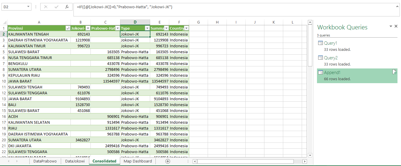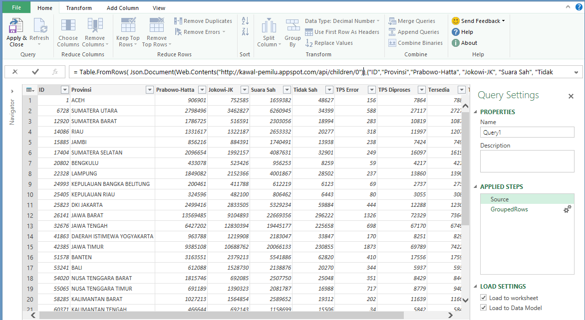To start with this analysis, I did a bit of inspection on http://kawalpemilu.org/script to get their data feed and make it the data source in PowerQuery.