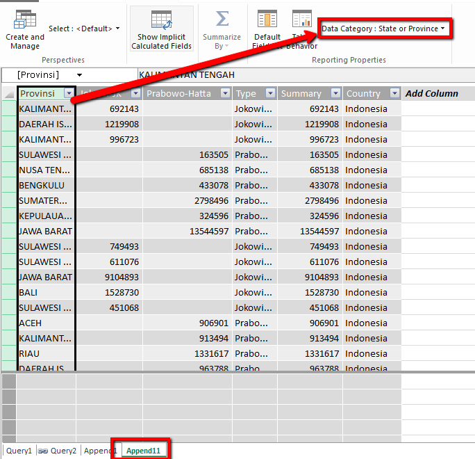 Now I have the required data to generate the PowerView distribution map. However before the data becomes usable for Map control in PowerView, I need to change the Province and Country column behaviour as geographic data using PowerPivot.