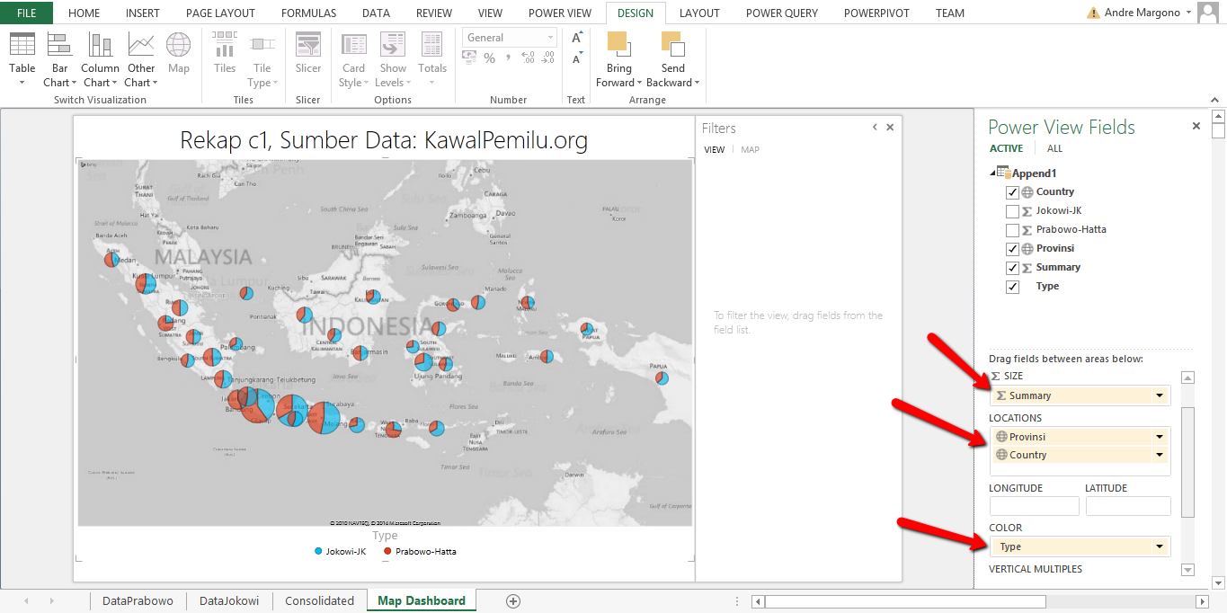 That resulting the consolidated query with the comparison of the total votes for each candidates. With a simple excel formula, I create Type column to be used in PowerView map as key of the candidates.