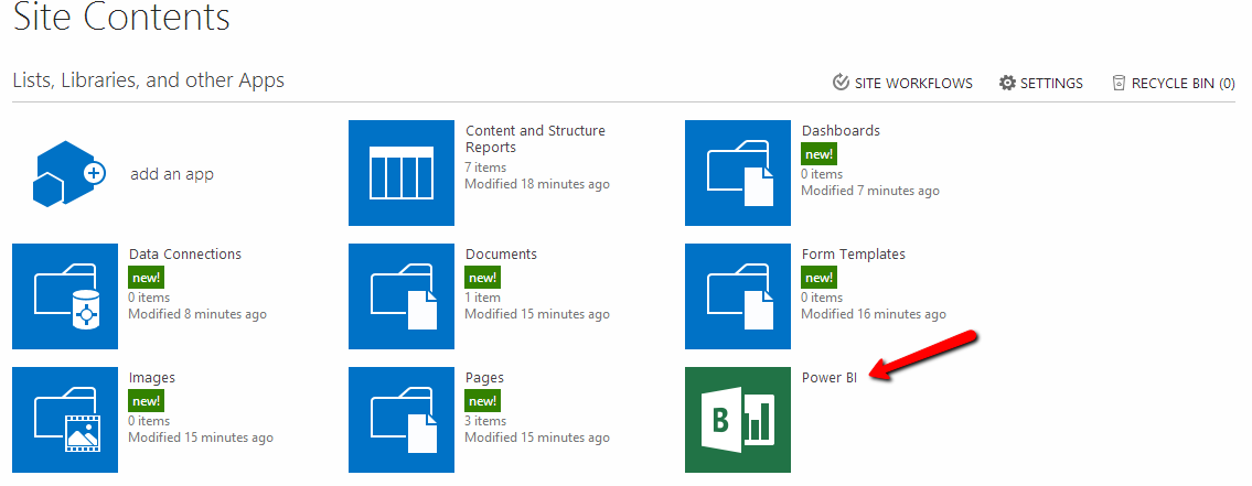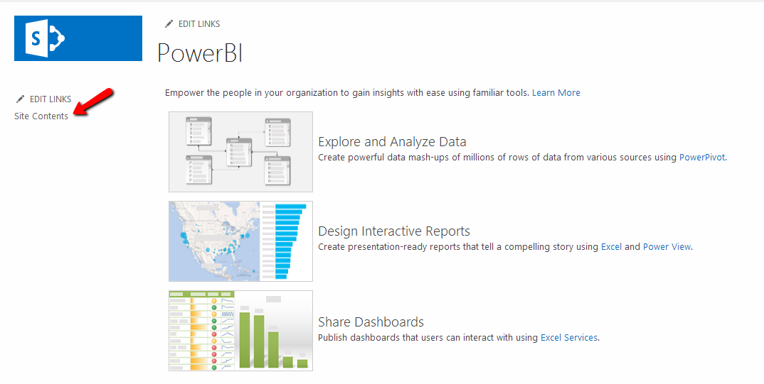 It will Display the default page with some instruction of BI capabilities. To add Power BI functionality to this site, click on Site Contents at the left hand side navigation.