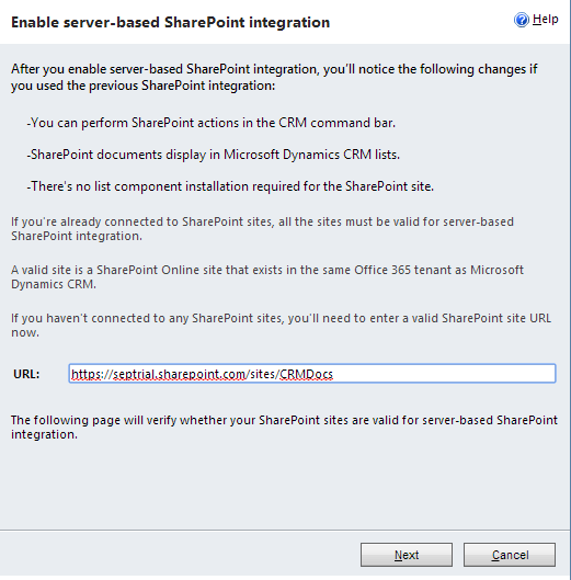 Click on Next and it will open up some validation whether the SharePoint site that we are referring is valid to be used for Dynamics CRM document repository. Important: Please read the Note and Disclaimer below the validation to ensure it does not break any of your privacy policy and once server-based integration, the older client-side integration can’t be enabled/used anymore.