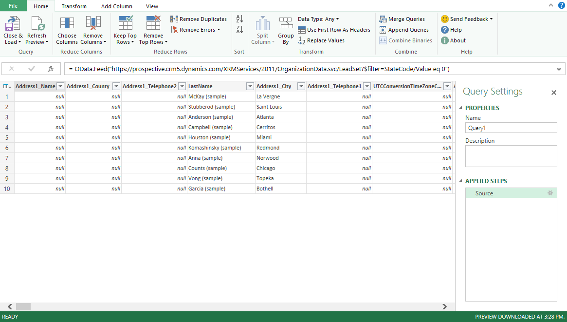 Once finished loading the CRM data, it will open up the Power Query Editor similar to: