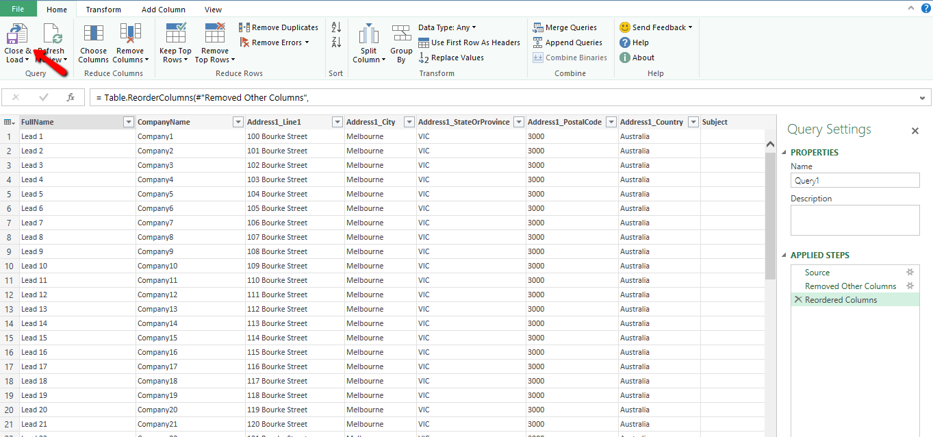 Once the columns selected, we could re-arrange the columns to make the data neat, then click on Close & Load