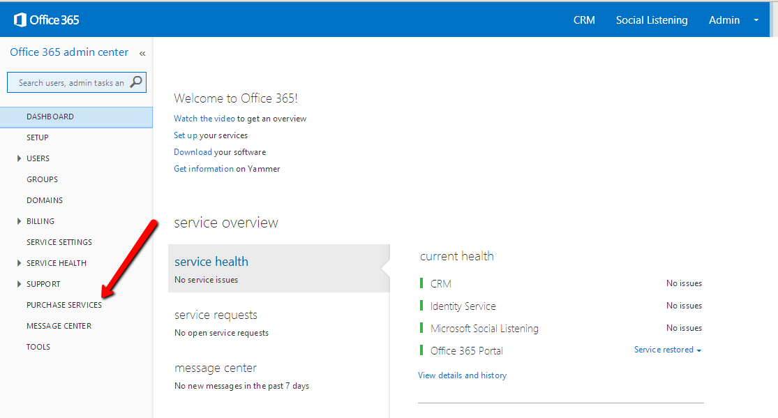 Before configuring the CRM side of SharePoint Integration, of course we need to setup the SharePoint site that will be used as the document location. Navigate to Office365 Admin Portal, click on Admin > SharePoint