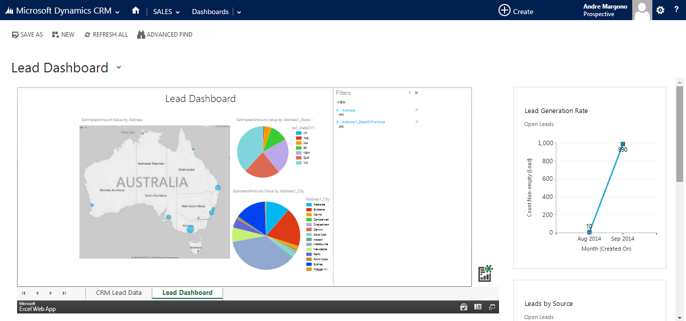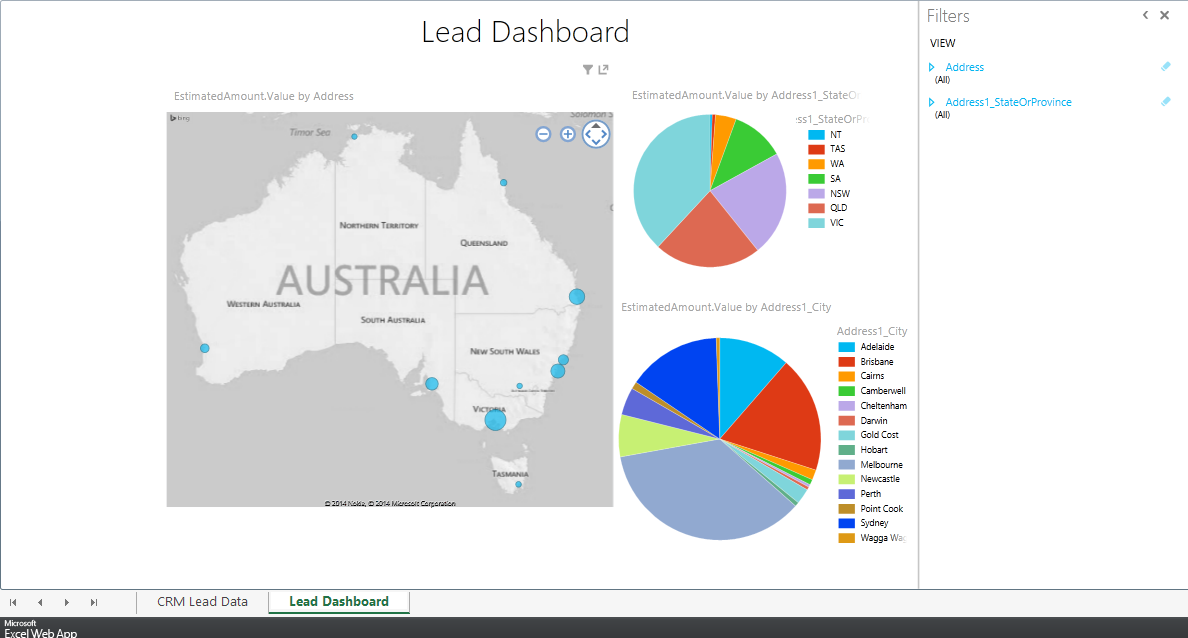 In this example, I will not connect to external data. But solely using the CRM lead data to show the demographics of where is the company’s most strategic places to market and sell. I will start with a basic Excel report that pulling down Lead data from CRM. Open Microsoft Excel with the latest Power Query installed. For installation of Power Query: http://www.microsoft.com/en-us/download/details.aspx?id=39379