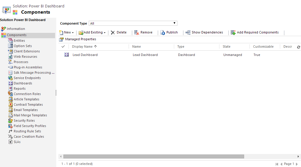 So, for this example, I created a brand new Solution called “Power BI Dashboard” and create new Dashboard and named it as “Lead Dashboard”