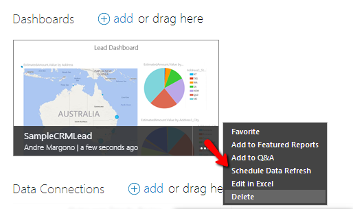 One of the coolest feature of Power BI is to set data refresh. Click on … at the bottom right of the dashboard tile to schedule the data refresh.