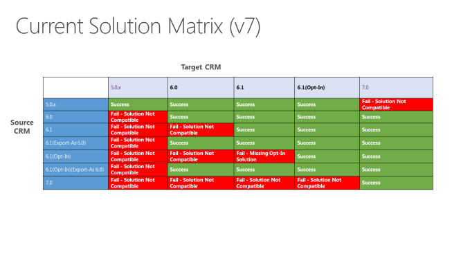 There has been a couple questions in the forum regarding the solution compatibility after Dynamics CRM 2015 upgrade, so below is the matrix that MattB from Microsoft shared, I hope this gives us a clear picture on which version of CRM that the solution was originated will be compatible with.