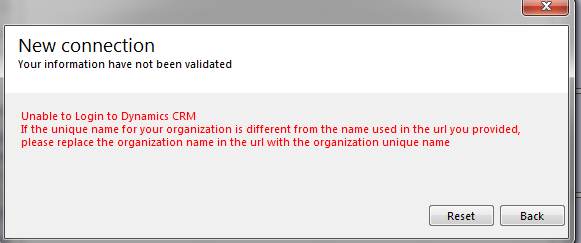 On the first screen when the connection wizard prompts the CRM Organization URL, typically I would enter my CRM online URL, e.g: https://mycrmonlinedev.crm6.dyanmics.com. However, when I tried to connect, I ran into the following error message:
