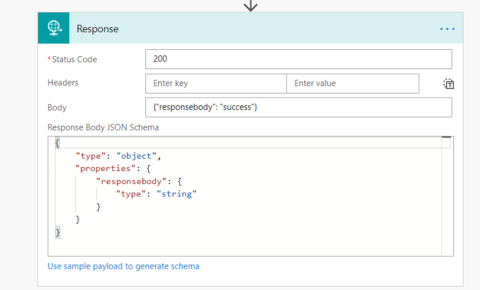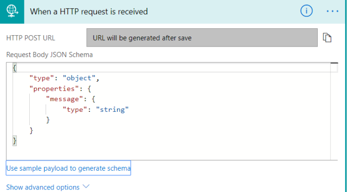 As any typical API, you will need to specify the data payload. To generate the payload schema, we can use the “Use sample payload to generate schema”. I’m going to use a simple payload to send the message: